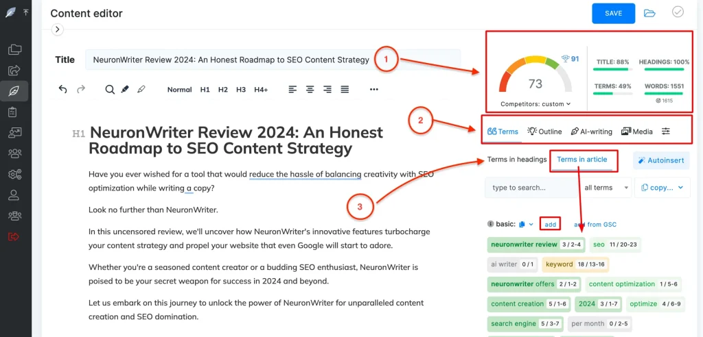 - AI-first advantage: Helps you avoid thin coverage by nudging you toward related concepts (entities) that matter.